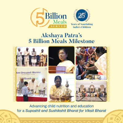 Step into these moments of pride and purpose as The Akshaya Patra Foundation celebrates its 5 billion meals milestone, captured through powerful glimpses of impact, leadership and hope.