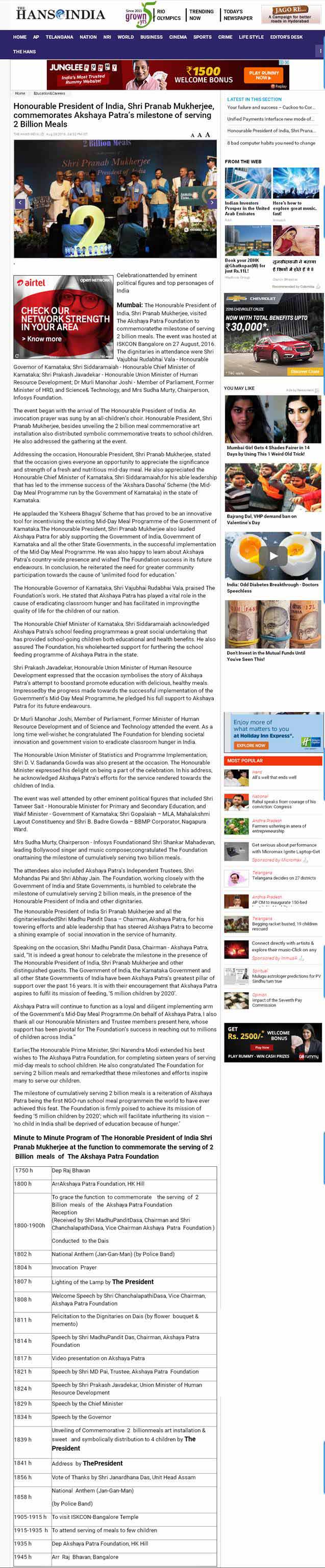 Honourable President of India, Shri Pranab Mukherjee commemorates Akshaya Patra's milestone of serving 2 billion meals