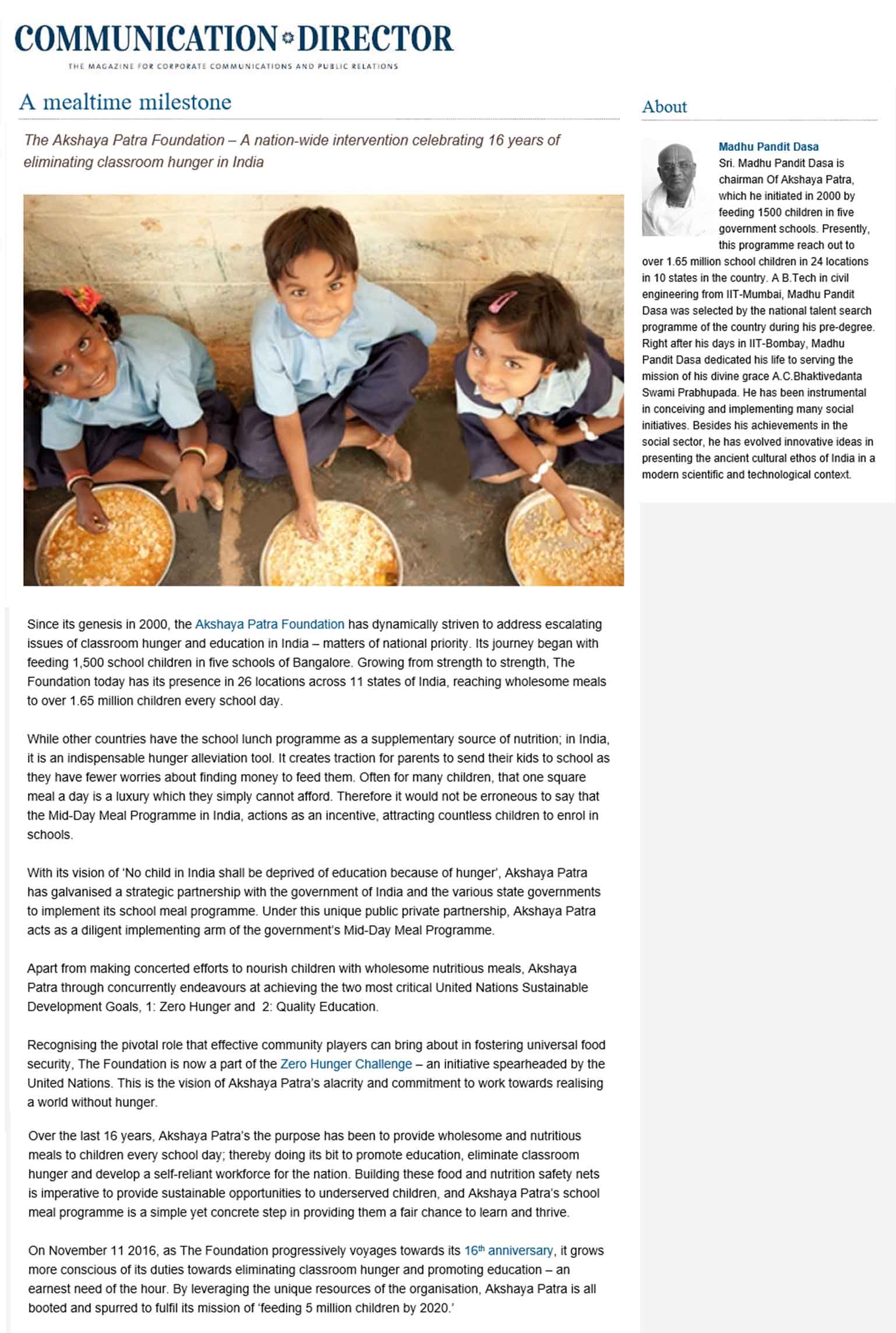 The Akshaya Patra Foundation’s 16 year anniversary celebrations