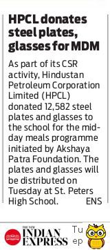HPCL donates steel plates, glasses for mid-day meals