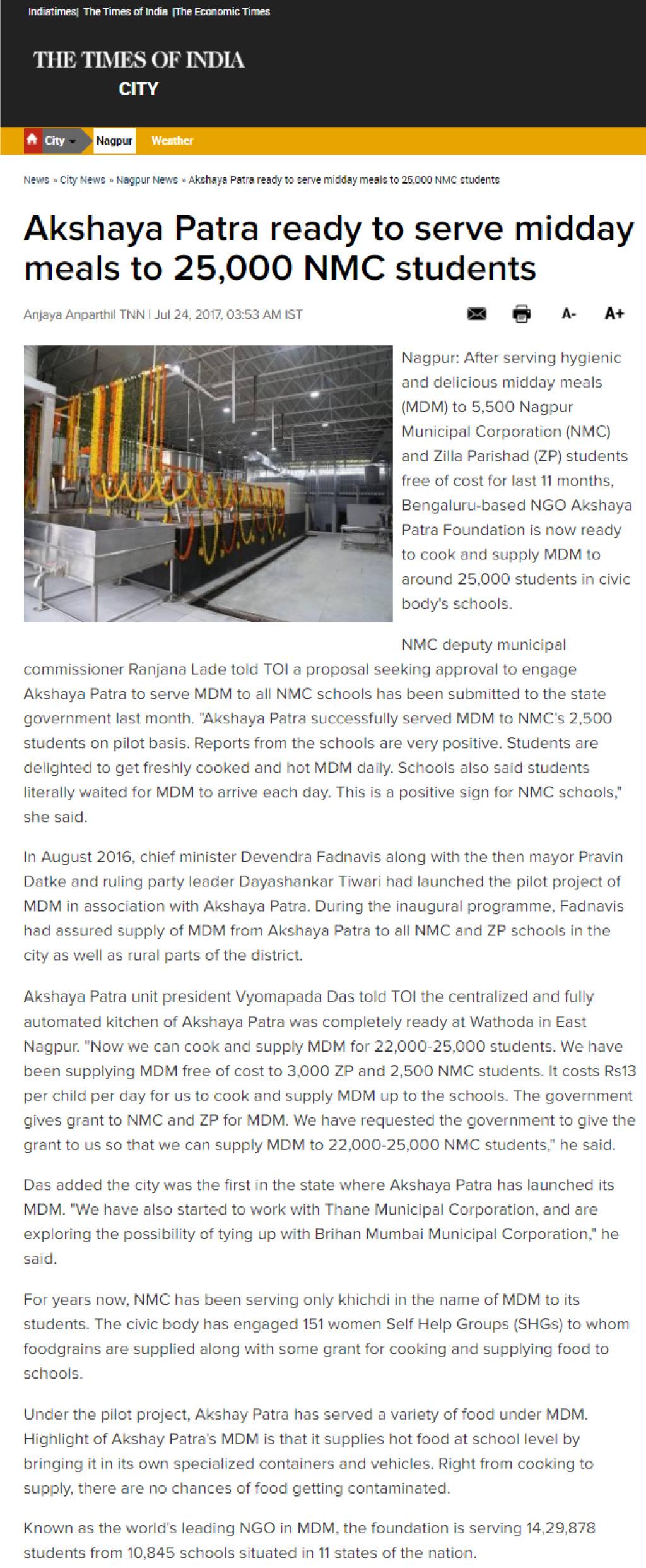 Akshaya Patra ready to serve midday meals to 25,000 NMC students