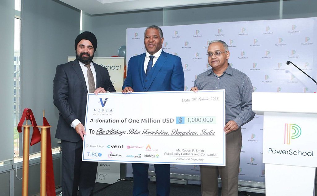 September 26, 2017, Bengaluru – Vista Equity Partners, the world’s leading private equity firm, focused exclusively on enterprise software, data, and technology solutions, together with several of its companies in India, partners with Akshaya Patra by pledging a contribution of USD 1 million over five years to aid in the Foundation’s mid-day meal plan. Robert F. Smith, Founder, Chairman and CEO of Vista Equity Partners, recently named by Forbes as one of the 100 Greatest Living Business Minds, announced the collaboration alongside Mr. Hardeep Gulati, CEO of PowerSchool, and Mr. Shridhar Venkat, CEO of The Akshaya Patra Foundation.