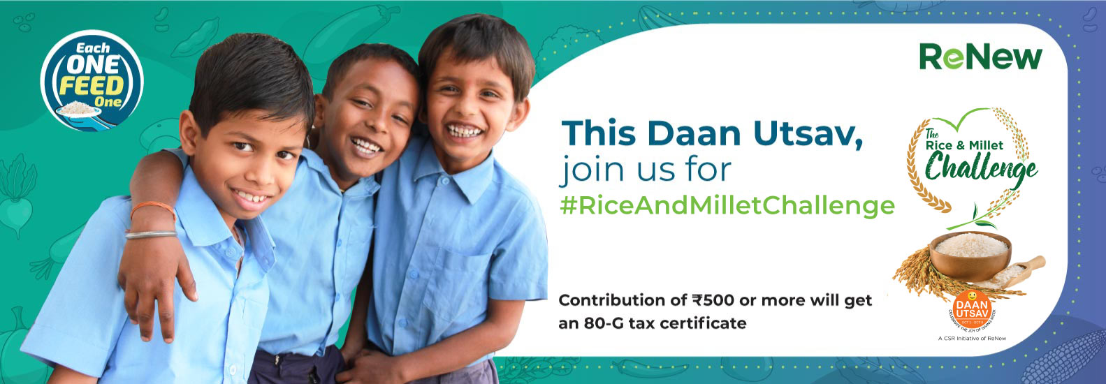 This Daan Utsav, we invite you to join us in the Rice & Millet Challenge to combat hunger and bring hope to underprivileged children. Your generosity will help provide essential meals to those facing food insecurity. For every ₹1,500 donated, you can provide meals to a child for an entire year, ensuring their access to healthy food and a brighter future. ReNew will match all contributions, doubling the impact of your donation.