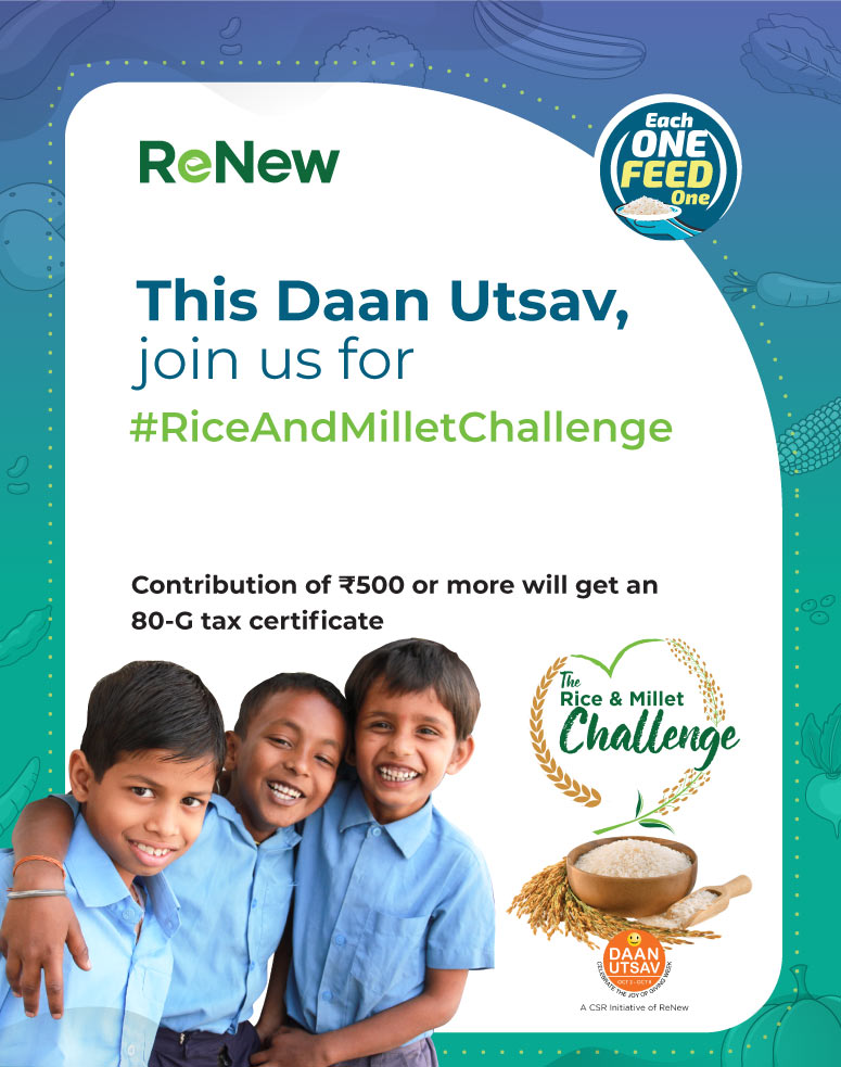 At ReNew, we believe in the power of giving back. This year, as part of our annual employee engagement campaign The Rice & Millet Challenge (formerly the ‘Rice Bucket Challenge’), we are launching a special collaboration with The Akshaya Patra Foundation to provide nutritious meals to children in need.